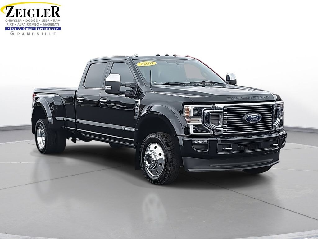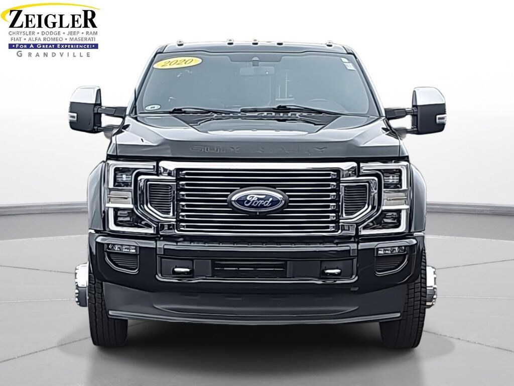 Certified. 2020 Ford F-450SD Platinum DRW DRW Agate Black Metallic 10 Speakers, 110V/400W Outlet, 19.5" Forged Polished Aluminum Wheels, 4-Wheel Disc Brakes, ABS brakes, Adjustable pedals, Air Conditioning, Alloy wheels, AM/FM radio: SiriusXM, Auto High-beam Headlights, Auto tilt-away steering wheel, Auto-dimming Rear-View mirror, Automatic temperature control, Brake assist, Bumpers: body-color, Camper Package, Compass, Delay-off headlights, Driver door bin, Driver vanity mirror, Dual front impact airbags, Dual front side impact airbags, Dual rear wheels, Electronic Stability Control, Emergency communication system: SYNC 3 911 Assist, Engine Block Heater, Exterior Parking Camera Rear, Flow-Through Console, Front anti-roll bar, Front Bucket Seats, Front Center Armrest, Front dual zone A/C, Front fog lights, Front reading lights, Fully automatic headlights, FX4 Off-Road Package, Garage door transmitter, GVWR: 14,000 lb Payload Package, Heated door mirrors, Heated front seats, Heated rear seats, Heated steering wheel, Hill Descent Control, Illuminated entry, Leather steering wheel, Limited Slip w/4.30 Axle Ratio, Memory seat, Navigation System, Off-Road Specifically Tuned Shock Absorbers, Order Code 773A, Outside temperature display, Overhead airbag, Overhead console, Panic alarm, Passenger door bin, Passenger vanity mirror, Pedal memory, Power door mirrors, Power driver seat, Power passenger seat, Power steering, Power windows, Radio data system, Radio: B&O System by Bang & Olufsen, Rain sensing wipers, Rear anti-roll bar, Rear Parking Sensors, Rear reading lights, Rear seat center armrest, Rear step bumper, Rear window defroster, Remote keyless entry, Security system, SiriusXM Radio, Speed control, Speed-sensing steering, Split folding rear seat, Steering wheel memory, Steering wheel mounted A/C controls, Steering wheel mounted audio controls, SYNC 3 Communications & Entertainment System, Tachometer, Telescoping steering wheel, Tilt steering wheel, Traction control, Trip computer, Turn signal indicator mirrors, Twin Panel Power Moonroof, Unique FX4 Off-Road Box Decal, Unique Platinum Leather 40/Console/40 Seats, Upfitter Switches (6), Variably intermittent wipers, Ventilated front seats.