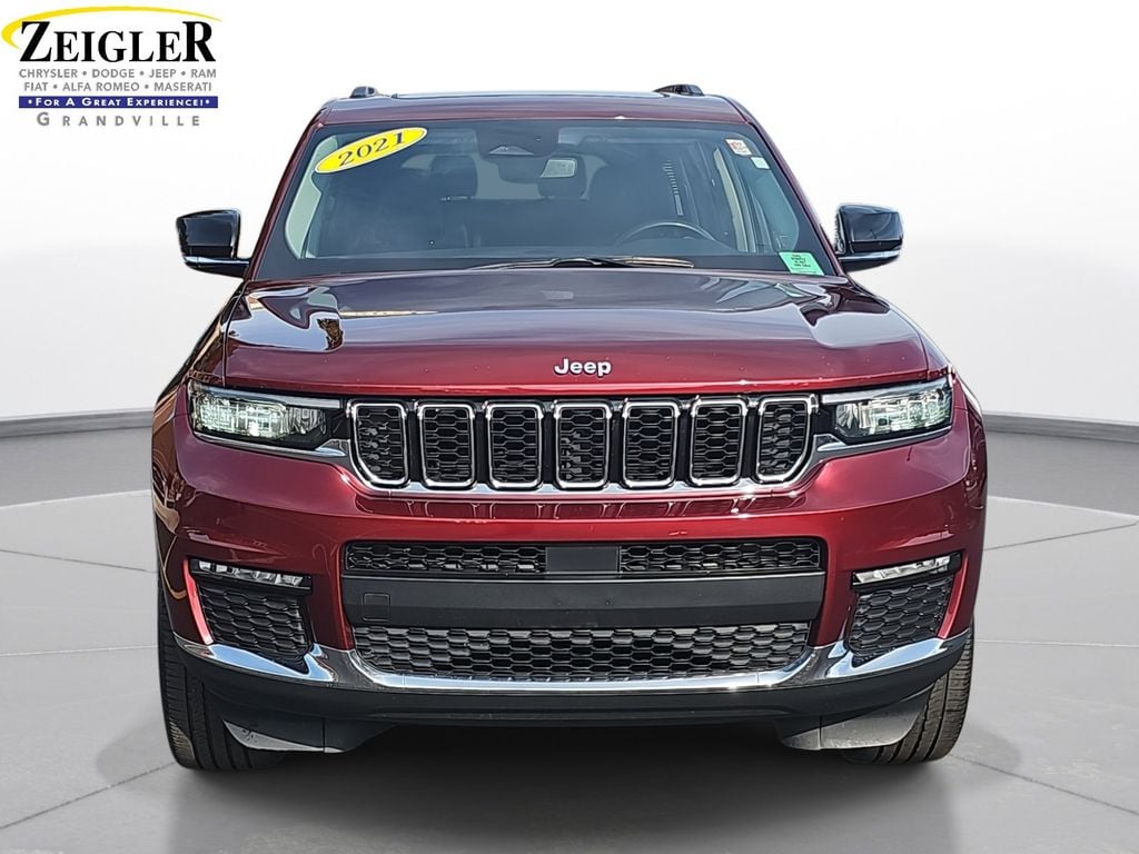 Certified. 2021 Jeep Grand Cherokee L Limited Velvet Red Pearlcoat 10.1" Touchscreen Display, 3.45 Rear Axle Ratio, 3rd row seats: split-bench, 4-Wheel Disc Brakes, 506 Watt Amplifier, 6 Speakers, 9 Amplified Speakers w/Subwoofer, ABS brakes, Air Conditioning, Alloy wheels, AM/FM radio: SiriusXM w/360L, Anti-whiplash front head restraints, Apple CarPlay, Apple CarPlay/Android Auto, Audio memory, Auto High-beam Headlights, Automatic temperature control, Brake assist, Bridgestone Brand Tires, Bumpers: body-color, Capri Leather Seats, Compass, Connected Travel & Traffic Services, Connectivity - US/Canada, Delay-off headlights, Disassociated Touchscreen Display, Driver door bin, Driver vanity mirror, Dual front impact airbags, Dual front side impact airbags, Dual-Pane Panoramic Sunroof, Electronic Stability Control, Emergency communication system, Four wheel independent suspension, Front anti-roll bar, Front Bucket Seats, Front Center Armrest w/Storage, Front dual zone A/C, Front fog lights, Front reading lights, Fully automatic headlights, Garage door transmitter, Google Android Auto, GPS Antenna Input, GPS Navigation, HD Radio, Heated door mirrors, Heated front seats, Heated rear seats, Heated steering wheel, Illuminated entry, Integrated Center Stack Radio, Integrated Voice Command w/Bluetooth, Interior Rear Facing Camera, Knee airbag, Leather steering wheel, Low tire pressure warning, Manual Fold Seatbacks, Memory seat, Normal Duty Suspension, Occupant sensing airbag, Outside temperature display, Overhead airbag, Overhead console, Panic alarm, ParkView Rear Back-Up Camera, Passenger door bin, Passenger vanity mirror, Power door mirrors, Power driver seat, Power Liftgate, Power passenger seat, Power steering, Power windows, Quick Order Package 22E, Radio data system, Radio: Uconnect 5 Nav w/10.1" Display, Radio: Uconnect 5 w/8.4" Display, Rear air conditioning, Rear anti-roll bar, Rear reading lights, Rear window defroster, Rear window wiper, Reclining 3rd row seat, Remote keyless entry, Roof rack: rails only, Security system, SiriusXM Satellite Radio, SiriusXM w/360L, Speed control, Speed-Sensitive Wipers, Split folding rear seat, Spoiler, Steering wheel mounted audio controls, Tachometer, Telescoping steering wheel, Tilt steering wheel, Traction control, Trip computer, Turn signal indicator mirrors, USB Host Flip, Variably intermittent wipers, Voltmeter, Wheels: 18" x 8.0" Fully Painted Aluminum 2, Wheels: 20" x 8.5" Polished/Painted Aluminum (DISC).