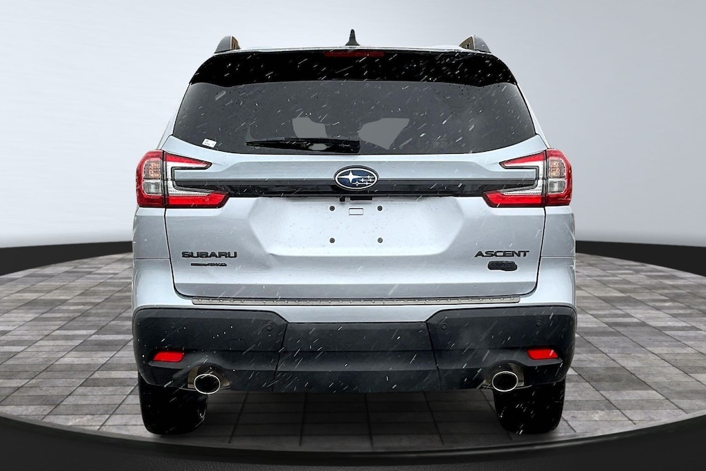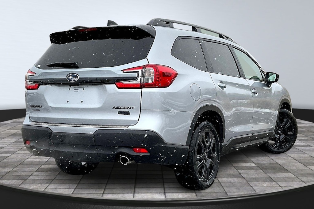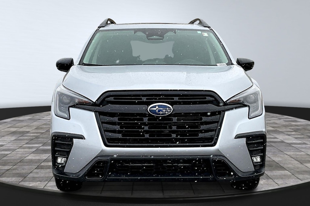 2025 Subaru Certified. Ice Silver Metallic AWD Ascent Onyx Edition Touring Lineartronic CVT 14 Speakers, 3rd row seats: bench, 4-Wheel Disc Brakes, ABS brakes, Air Conditioning, Alloy wheels, AM/FM radio: SiriusXM with 360L, Apple CarPlay & Android Auto, Auto High-beam Headlights, Auto-dimming Rear-View mirror, Automatic temperature control, Brake assist, Bumpers: body-color, Compass, Delay-off headlights, Driver door bin, Driver vanity mirror, Dual front impact airbags, Dual front side impact airbags, Electronic Stability Control, Emergency communication system: MySubaru Safety (3-year free trial), Exterior Parking Camera Rear, Four wheel independent suspension, Front anti-roll bar, Front Bucket Seats, Front Center Armrest, Front dual zone A/C, Front fog lights, Front reading lights, Fully automatic headlights, Garage door transmitter: HomeLink, harman/kardon® Speakers, Heated & Ventilated Front Bucket Seats, Heated door mirrors, Heated front seats, Heated rear seats, Heated steering wheel, HVAC memory, Illuminated entry, Knee airbag, Leather Shift Knob, Leather steering wheel, Low tire pressure warning, Memory seat, Navigation System, Occupant sensing airbag, Outside temperature display, Overhead airbag, Overhead console, Panic alarm, Passenger door bin, Passenger vanity mirror, Perforated Nappa Leather-Trimmed Upholstery, Power door mirrors, Power driver seat, Power Liftgate, Power moonroof, Power passenger seat, Power steering, Power windows, Radio data system, Radio: Subaru 11.6" Multimedia System w/Navigation, Rain sensing wipers, Rear air conditioning, Rear anti-roll bar, Rear reading lights, Rear window defroster, Rear window wiper, Reclining 3rd row seat, Remote keyless entry, Security system, Speed control, Speed-sensing steering, Split folding rear seat, Spoiler, Steering wheel mounted audio controls, Tachometer, Telescoping steering wheel, Tilt steering wheel, Traction control, Trip computer, Turn signal indicator mirrors, Variably intermittent wipers, Ventilated front seats, and Wheels: 20" x 7.5 J Aluminum Alloy w/Black Finish.