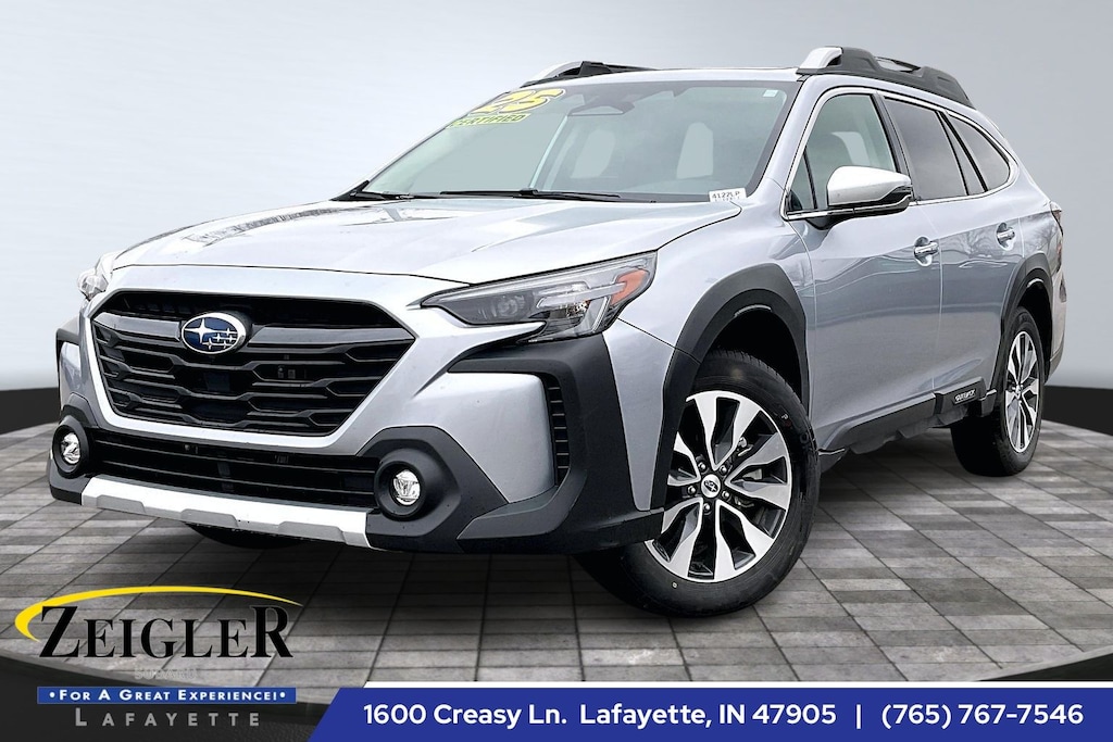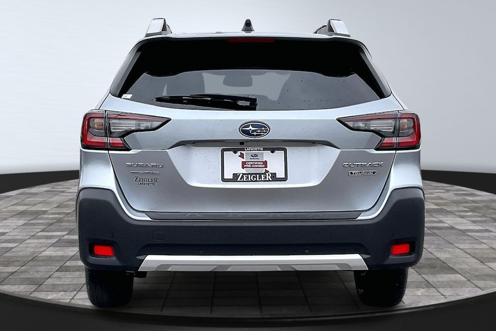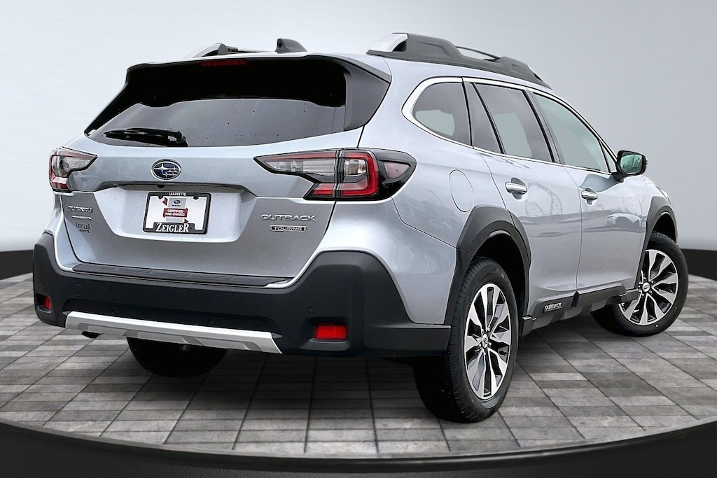 2025 Subaru Certified. Ice Silver Metallic AWD Outback Touring CVT Lineartronic Standard Model, 12 Speakers, 4-Wheel Disc Brakes, ABS brakes, Air Conditioning, All-Weather Floor Liners, Alloy wheels, AM/FM radio: SiriusXM with 360L, Apple CarPlay & Android Auto, Auto High-beam Headlights, Auto-Dimming Exterior Mirror w/Approach Light, Auto-dimming Rear-View mirror, Automatic temperature control, Brake assist, Bumpers: body-color, Compass, Driver door bin, Driver vanity mirror, Dual front impact airbags, Dual front side impact airbags, Electronic Stability Control, Emergency communication system: MySubaru Safety (3-year free trial), Exterior Parking Camera Rear, Four wheel independent suspension, Front anti-roll bar, Front Bucket Seats, Front Center Armrest w/Storage, Front dual zone A/C, Front fog lights, Front reading lights, Fully automatic headlights, Garage door transmitter: HomeLink, harman/kardon® Speakers, Heated & Ventilated Front Bucket Seats, Heated door mirrors, Heated front seats, Heated rear seats, Heated steering wheel, HVAC memory, Illuminated entry, Knee airbag, Leather Shift Knob, Leather steering wheel, LED Upgrade, Low tire pressure warning, Memory seat, Navigation system: TomTom Navigation w/what3words, Occupant sensing airbag, Outside temperature display, Overhead airbag, Overhead console, Panic alarm, Passenger door bin, Passenger vanity mirror, Perforated Nappa Leather-Trimmed Upholstery, Power door mirrors, Power driver seat, Power Liftgate, Power moonroof, Power passenger seat, Power steering, Power windows, Radio: Subaru 11.6" Multimedia System w/Navigation, Rear anti-roll bar, Rear Bumper Cover, Rear Seat Back Protector, Rear seat center armrest, Rear window defroster, Rear window wiper, Remote CD player, Remote keyless entry, Roof rack, Security system, Speed control, Speed-sensing steering, Split folding rear seat, Spoiler, Steering wheel mounted audio controls, Tachometer, Telescoping steering wheel, Tilt steering wheel, Traction control, Trip computer, Turn signal indicator mirrors, Variably intermittent wipers, Ventilated front seats, and Wheels: 18" x 7J Black Aluminum-Alloy.