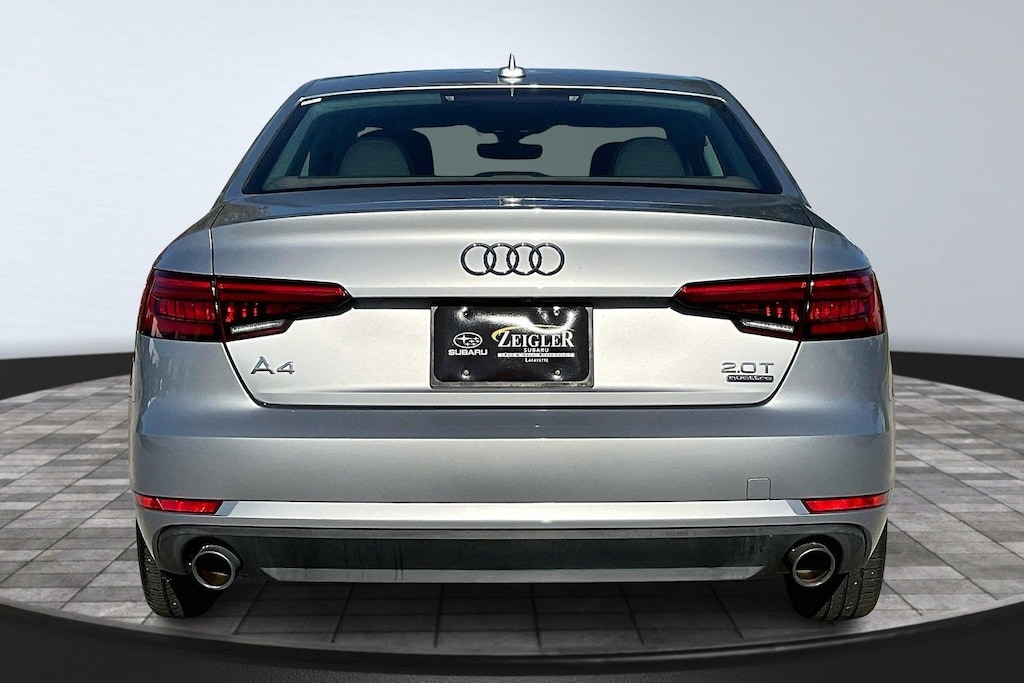 Priced below KBB Fair Purchase Price! 2017 Audi Florett Silver Metallic quattro A4 2.0T Premium quattro 7-Speed Automatic S tronic 10 Speakers, 4-Wheel Disc Brakes, ABS brakes, Air Conditioning, Alloy wheels, AM/FM radio, Anti-whiplash front head restraints, Auto-dimming Rear-View mirror, Automatic temperature control, Brake assist, Bumpers: body-color, CD player, Compass, Delay-off headlights, Driver door bin, Driver vanity mirror, Dual front impact airbags, Dual front side impact airbags, Electronic Stability Control, Exterior Parking Camera Rear, Four wheel independent suspension, Front anti-roll bar, Front Bucket Seats, Front Center Armrest, Front dual zone A/C, Front fog lights, Front reading lights, Garage door transmitter: HomeLink, Heated door mirrors, High intensity discharge headlights: Xenon plus, Illuminated entry, Knee airbag, Leather Seating Surfaces, Leather Shift Knob, Leather steering wheel, Low tire pressure warning, Occupant sensing airbag, Outside temperature display, Overhead airbag, Overhead console, Panic alarm, Passenger door bin, Passenger vanity mirror, Power door mirrors, Power driver seat, Power Front Bucket Seats, Power moonroof, Power passenger seat, Power steering, Power windows, Radio data system, Radio: Audi Sound System, Rain sensing wipers, Rear air conditioning, Rear anti-roll bar, Rear fog lights, Rear reading lights, Rear seat center armrest, Rear window defroster, Remote keyless entry, Speed control, Speed-sensing steering, Speed-Sensitive Wipers, Split folding rear seat, Steering wheel mounted audio controls, Tachometer, Telescoping steering wheel, Tilt steering wheel, Traction control, Trip computer, Turn signal indicator mirrors, Variably intermittent wipers, and Wheels: 7.5" x 17" 5-Parallel Spoke Design.