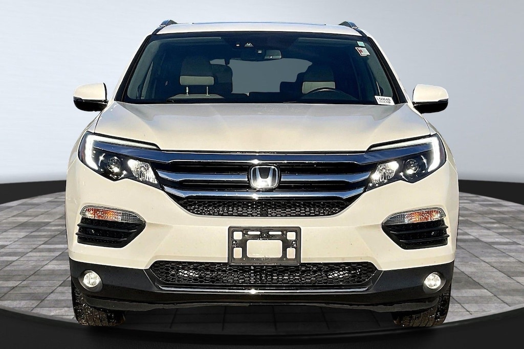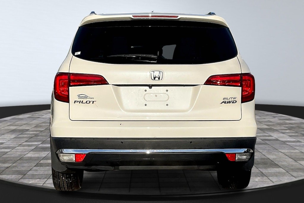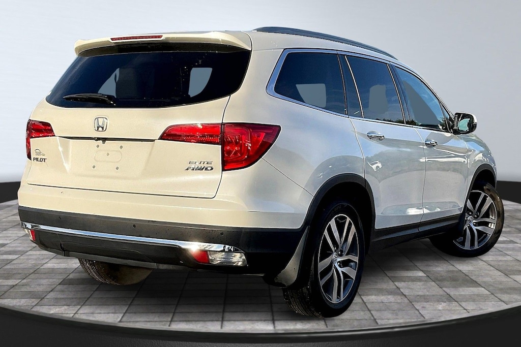 2017 Honda White Diamond Pearl AWD Pilot Elite 9-Speed Automatic 10 Speakers, 20" Alloy Wheels, 3rd row seats: split-bench, 4-Wheel Disc Brakes, 4.334 Axle Ratio, A/V remote, ABS brakes, Air Conditioning, Alloy wheels, AM/FM radio: SiriusXM, Apple CarPlay/Android Auto, Auto High-beam Headlights, Auto-dimming Rear-View mirror, Automatic temperature control, Brake assist, Bumpers: body-color, Compass, Delay-off headlights, Driver door bin, Driver vanity mirror, Dual front impact airbags, Dual front side impact airbags, Electronic Stability Control, Emergency communication system: HondaLink Assist, Exterior Parking Camera Rear, Four wheel independent suspension, Front anti-roll bar, Front Bucket Seats, Front Center Armrest, Front dual zone A/C, Front fog lights, Front reading lights, Fully automatic headlights, Garage door transmitter: HomeLink, Headphones, Heated & Ventilated Front Bucket Seats, Heated door mirrors, Heated front seats, Heated rear seats, Heated steering wheel, Honda Satellite-Linked Navigation System, Illuminated entry, Leather Shift Knob, Low tire pressure warning, Memory seat, Navigation System, Occupant sensing airbag, Outside temperature display, Overhead airbag, Overhead console, Panic alarm, Passenger door bin, Passenger vanity mirror, Perforated Leather-Trimmed Seats, Power door mirrors, Power driver seat, Power Liftgate, Power moonroof, Power passenger seat, Power steering, Power windows, Radio data system, Radio: AM/FM/HD Premium Audio System, Rain sensing wipers, Rear air conditioning, Rear anti-roll bar, Rear audio controls, Rear reading lights, Rear window defroster, Rear window wiper, Remote keyless entry, Roof rack: rails only, Security system, SiriusXM Radio, Speed control, Speed-sensing steering, Speed-Sensitive Wipers, Split folding rear seat, Spoiler, Steering wheel mounted audio controls, Tachometer, Telescoping steering wheel, Tilt steering wheel, Traction control, Trip computer, Turn signal indicator mirrors, Variably intermittent wipers, and Ventilated front seats.