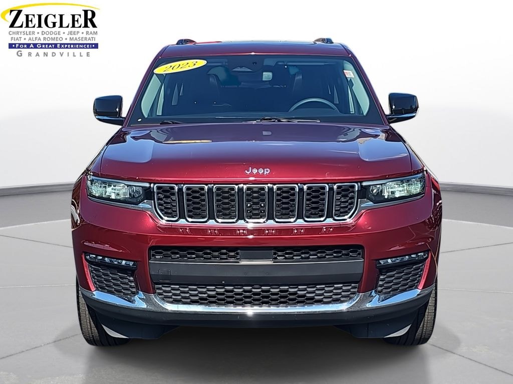 2023 Jeep Grand Cherokee L Limited Velvet Red Pearlcoat 3.45 Rear Axle Ratio, 3rd row seats: split-bench, 4-Wheel Disc Brakes, 6 Speakers, ABS brakes, Active Noise Control System, Air Conditioning, Alloy wheels, AM/FM radio: SiriusXM with 360L, Anti-whiplash front head restraints, Audio memory, Auto High-beam Headlights, Automatic temperature control, Brake assist, Bumpers: body-color, Capri Leatherette Seats, Compass, Delay-off headlights, Driver door bin, Driver vanity mirror, Dual front impact airbags, Dual front side impact airbags, Dual-Pane Panoramic Sunroof, Electronic Stability Control, Emergency communication system, Four wheel independent suspension, Front anti-roll bar, Front Bucket Seats, Front Center Armrest w/Storage, Front dual zone A/C, Front fog lights, Front reading lights, Fully automatic headlights, Garage door transmitter, Heated door mirrors, Heated front seats, Heated rear seats, Heated steering wheel, Illuminated entry, Interior Rear Facing Camera, Knee airbag, Low tire pressure warning, Manual Fold Seatbacks, Memory seat, Molded In Color Black/Gloss Black Roof Rails, Navigation System, Normal Duty Suspension, Occupant sensing airbag, Outside temperature display, Overhead airbag, Overhead console, Panic alarm, ParkView Rear Back-Up Camera, Passenger door bin, Passenger vanity mirror, Power door mirrors, Power driver seat, Power Liftgate, Power passenger seat, Power steering, Power windows, Quick Order Package 23E, Radio data system, Radio: Uconnect 5 Nav w/10.1" Display, Rear air conditioning, Rear anti-roll bar, Rear reading lights, Rear window defroster, Rear window wiper, Reclining 3rd row seat, Remote keyless entry, Security system, Speed control, Speed-Sensitive Wipers, Split folding rear seat, Spoiler, Steering wheel mounted audio controls, Tachometer, Telescoping steering wheel, Tilt steering wheel, Traction control, Trip computer, Turn signal indicator mirrors, Variably intermittent wipers, Voltmeter, Wheels: 18" x 8.0" Fully Painted Aluminum, Wheels: 18" x 8.0" Polished/Painted Aluminum.