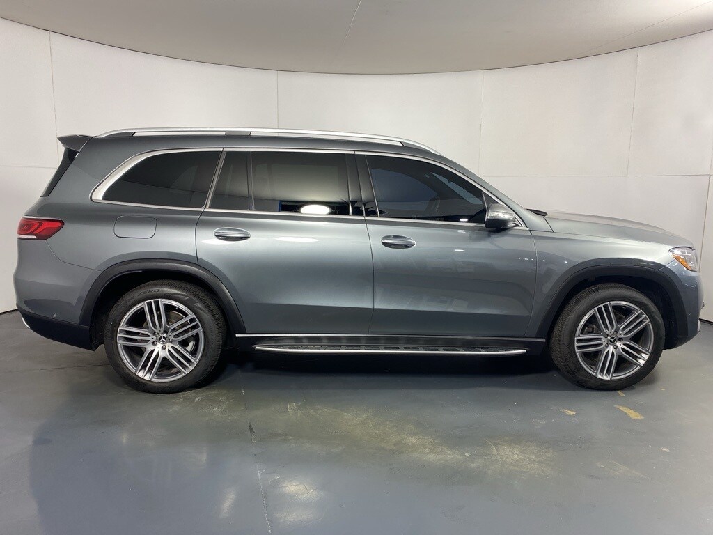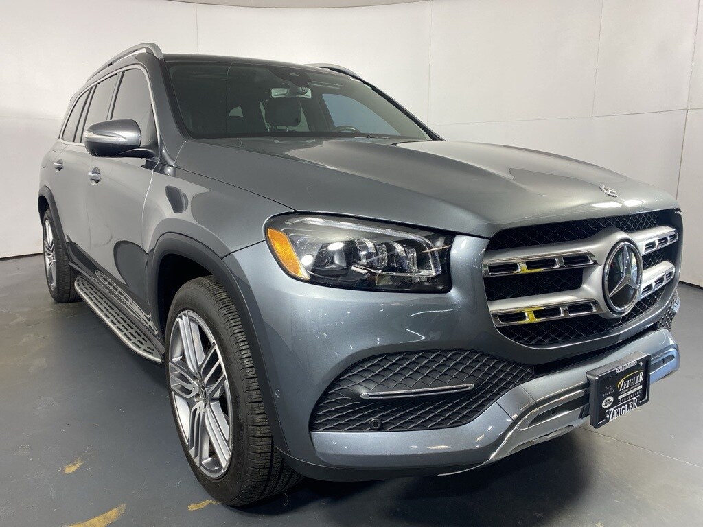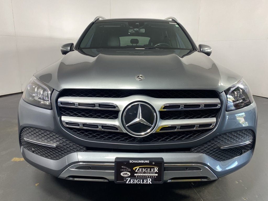 Available at Jaguar Land Rover Schaumburg is a remarkable pre-owned 2021 Mercedes-Benz GLS 450 with 33,140 miles on the odometer. This luxury SUV makes a strong first impression with its sophisticated Selenite Gray exterior, a color that beautifully accentuates its sculpted body lines and commanding presence. Inside, the spacious and refined cabin is appointed with premium Black Leather, creating a serene and elegant environment for all occupants. This GLS 450, often referred to as the "S-Class of SUVs," combines timeless Mercedes-Benz design with a high level of comfort and advanced features.