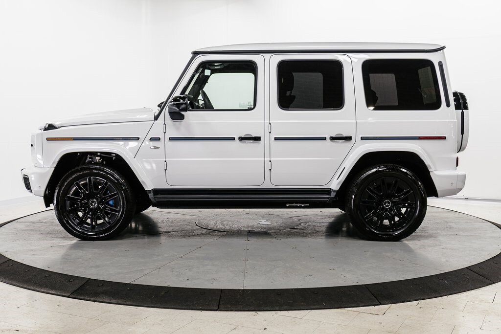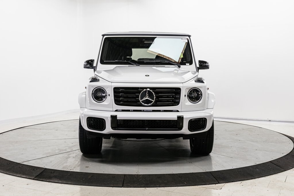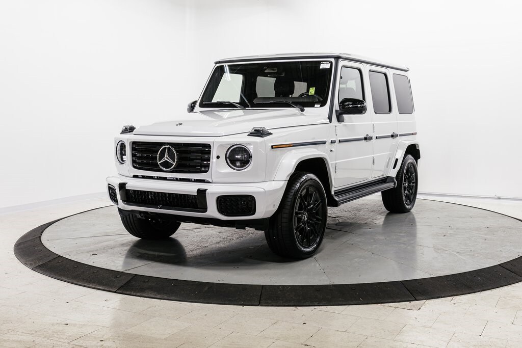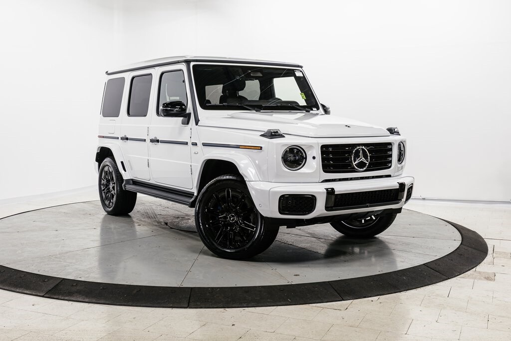 Active Multicontour Front Seats w/Massage, AMG® Line, Brake Calipers in Edition Specific Blue, Design Box, Edition 1, Edition One, Exclusive Interior Package Plus (P77), Exterior Protective Strips w/Trim Insert, MANUFAKTUR Black Running Boards, MANUFAKTUR Logo Package in Black, Night Package (P55), Seat Comfort Package, Wheels: 20" AMG® 10-Spoke Light-Alloy Black. 2025 Mercedes-Benz G-Class G 580 4MATIC® 4MATIC® MANUFAKTUR Moonlight White magno 4MATIC® 2-Speed Automatic Electric Motor