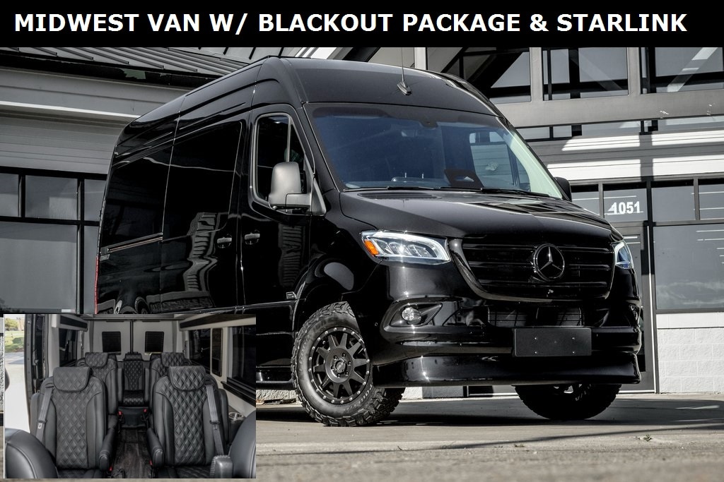 LOADED! $10,185 IN OPTIONS! $206,220! OBISIDIAN BLACK METALLIC EXTERIOR WITH SHADOW FORGE DECOR PACKAGE AND BLACK DENALI GRAIN WOOD! THIS CUSTOM MIDWEST AUTOMOTIVE DESIGNS G45 9-PASSENGER LUXURY COACH FEATURES A FULL GROUND EFFECTS AEROKIT, NEW RUNNING BOARDS WITH INTEGRATED STEP & TREAD STONE, AND NEW FRONT SPOILER WITH MATCHING REAR FASCIA AND HITCH COVER! POWER PACK UPGRADE INCLUDES A 270Ah LITHIUM BATTLE BORN BATTERY (3.5 kWh), DUAL 40-AMP CHARGERS, 2000W XANTREX INVERTER, 200W SOLAR PANEL, AND ENGINE-DRIVEN HVAC SYSTEM! STARLINK SATELLITE INTERNET ROUTER FOR CONNECTIVITY ON THE ROAD! COLOR CHANGING MAYBACH CEILING PANEL WITH OVERHEAD SIDE STORAGE CABINETS ($4,500)! SEAT HEAT & MASSAGE FOR ALL CAPTAINS! FOLDING LAP TABLES AND TWO POWER LEG LIFTS! ALPINE SOUND SYSTEM WITH DEDICATED AMP & SUBWOOFER ($2,250)! FIRELY TOUCHSCREEN CONTROL SYSTEM! LUXURY CUSTOM SEATING WITH DOUBLE NEEDLE STITCHED ACCENTS, HANDMADE WOODWORK THROUGHOUT, AND COMPOSITE WOOD GRAIN FLOORING! SLIDE DRAWER REFRIGERATOR ($1,493)! ALL SEASON TIRES ON BLACK RIMS! NEW STAINLESS STEEL EXHAUST TIP! REAR POWER SOFA, SIX CAPTAINS CHAIRS, AND VOYAGER GALAXY FLOORING IN BLACK! COLOR MATCHED REAR LICENSE PLATE LIGHT COVER AND SIDE CLADDING! SOFT TOUCH AUTOMOTIVE FABRIC THROUGHOUT WITH CUSTOM WAINSCOTING AND CUP HOLDERS! SUPER CLEAN! BUILT BY MIDWEST AUTOMOTIVE DESIGNSA MERCEDES-BENZ EXPERT UPFITTER! THIS IS THE ONE!