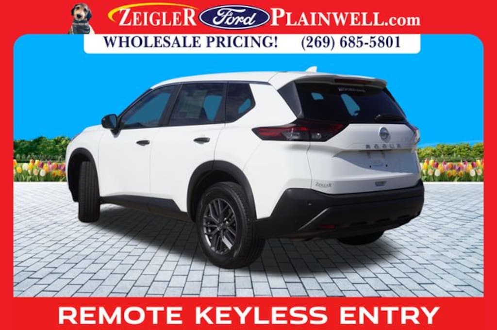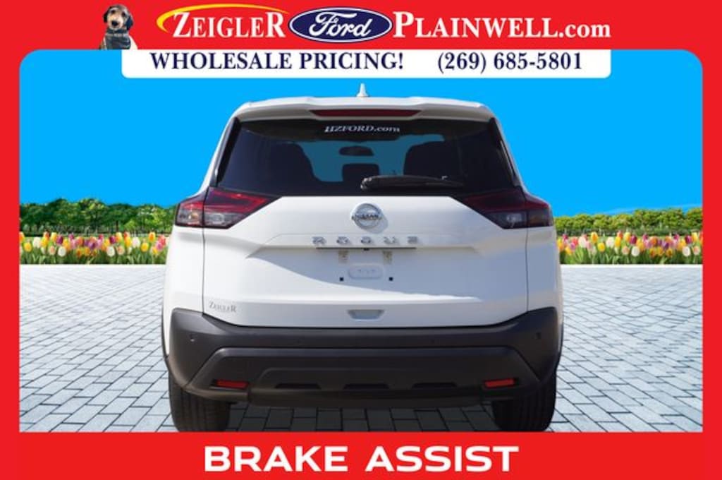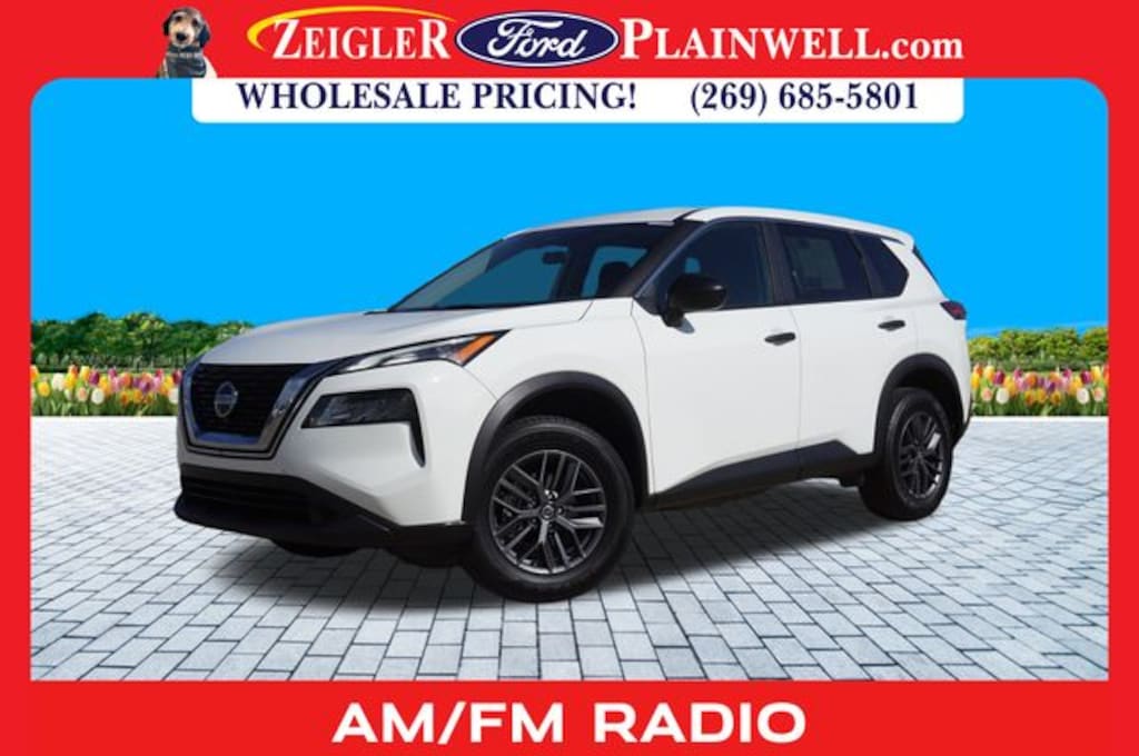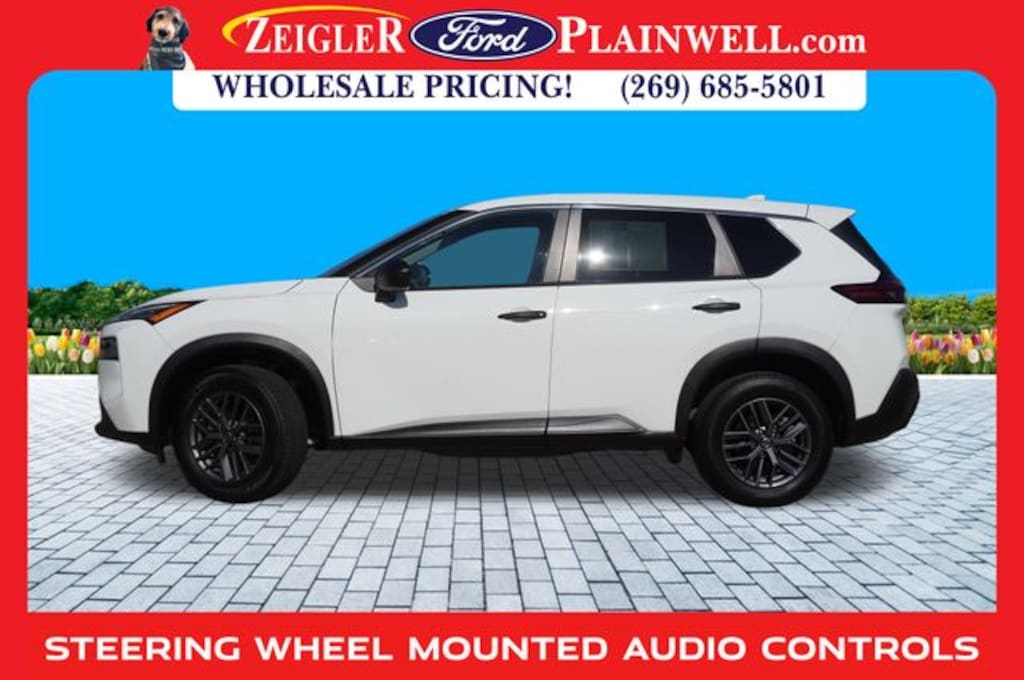 2021 Nissan Rogue S Glacier White 2.5L I4 DOHC 16V 17" Aluminum Alloy Wheels, AM/FM Radio, Blind Spot Warning, Brake assist, Electronic Stability Control, Front Bucket Seats, Fully automatic headlights, NissanConnect featuring Apple CarPlay and Android Auto, Panic alarm, Power door mirrors, Rear Parking Sensors, Remote keyless entry, Speed-Sensitive Wipers, Steering wheel mounted audio controls. 27/35 City/Highway MPG