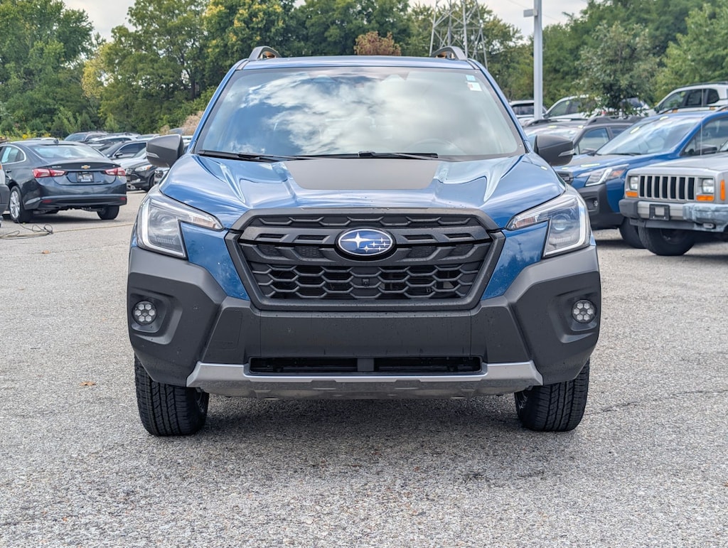 2023 Subaru Geyser Blue AWD Forester Wilderness Lineartronic CVT 8" Audio w/harman/kardon & Power Rear Gate (harman/kardon 9-Speaker Audio System, Power Rear Gate, and Radio: Subaru Starlink 8.0" Multimedia Nav System), 4-Wheel Disc Brakes, 4.11 Axle Ratio, 6 Speakers, ABS brakes, Air Conditioning, Alloy wheels, AM/FM radio: SiriusXM, Anti-whiplash front head restraints, Auto High-beam Headlights, Auto-Dimming Mirror w/Compass & HomeLink, Automatic temperature control, Brake assist, Bumpers: body-color, Cargo Net, CD player, Driver door bin, Driver vanity mirror, Dual front impact airbags, Dual front side impact airbags, Electronic Stability Control, Emergency communication system: STARLINK Safety and Security (Subscription Required), Exterior Parking Camera Rear, Four wheel independent suspension, Front anti-roll bar, Front Bucket Seats, Front Center Armrest, Front dual zone A/C, Front fog lights, Front reading lights, Fully automatic headlights, Heated door mirrors, Heated Front Bucket Seats, Heated front seats, Illuminated entry, Knee airbag, Leather Shift Knob, Low tire pressure warning, Navigation System, Occupant sensing airbag, Outside temperature display, Overhead airbag, Overhead console, Panic alarm, Passenger door bin, Passenger vanity mirror, Power door mirrors, Power driver seat, Power moonroof: Panoramic, Power steering, Power windows, Radio data system, Radio: Subaru Starlink 8.0" Multimedia Plus System, Rear anti-roll bar, Rear seat center armrest, Rear Seatback Protector - Wilderness, Rear window defroster, Rear window wiper, Remote keyless entry, Roof rack: rails only, Security system, Speed control, Speed-sensing steering, Split folding rear seat, Spoiler, STARLINK/Apple CarPlay/Android Auto, Steering wheel mounted audio controls, Tachometer, Telescoping steering wheel, Textured StarTex Upholstery, Tilt steering wheel, Traction control, Trip computer, Turn signal indicator mirrors, Variably intermittent wipers, and Wheels: 17" x 7.0 J Matte Black Finish Alum-Alloy.