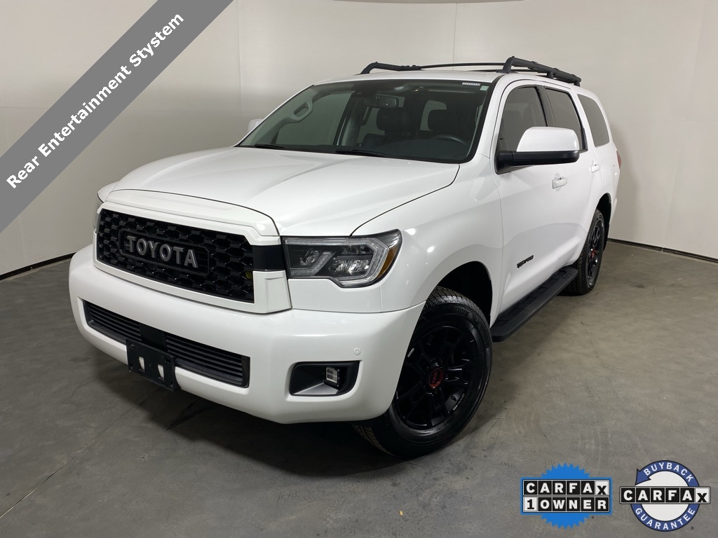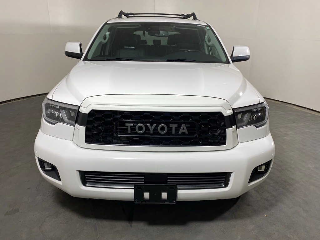 Recent Arrival! 5.7 V8 Engine, 3rd row seats, split-bench, Apple CarPlay/Android Auto, Auto-Dimming Rear-View Mirror, Door Scuff Plate, Exterior Parking Camera Rear, Front fog lights, Front Heated Bucket Seats, Fully automatic headlights, Headlight cleaning, Heated door mirrors, Heated front seats, Leather Seat Trim, Navigation system: Dynamic Navigation (3-year trial), Panic alarm, Power moonroof, Security system, Speed control, Spoiler, TRD Pro Package, Wheels: 18" Black BBS Forged Aluminum Alloy. 2021 Toyota Sequoia TRD Pro White