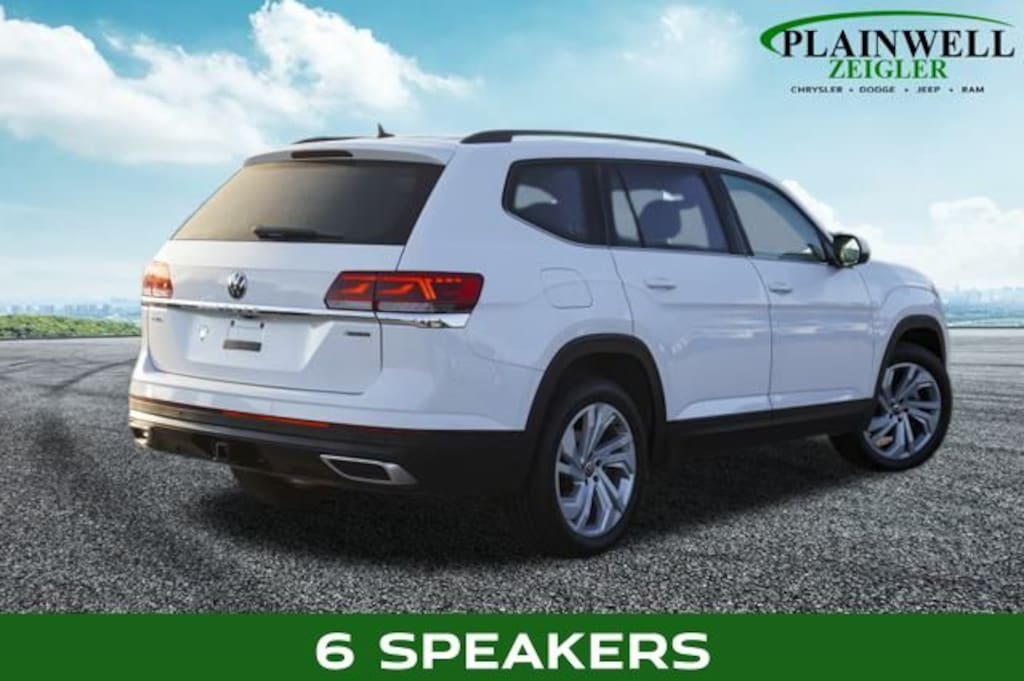 Pure White 2023 Volkswagen Atlas 3.6L V6 SE w/Technology Panoramic Sunroof Package AWD 8-Speed Automatic with Tiptronic 3.6L VR6 3rd row seats: split-bench, 6 Speakers, Air Conditioning, AM/FM radio: SiriusXM with 360L, Auto-dimming Rear-View mirror, Brake assist, Bumpers: body-color, Compass, Delay-off headlights, Driver door bin, Driver vanity mirror, Electronic Stability Control, Exterior Parking Camera Rear, Four wheel independent suspension, Front Bucket Seats, Front Center Armrest, Front dual zone A/C, Front fog lights, Front reading lights, Heated Comfort Front Bucket Seats, Heated door mirrors, Heated front seats, Illuminated entry, Panic alarm, Panoramic Sunroof Package, Passenger door bin, Perforated V-Tex Leatherette Seating Surfaces, Power door mirrors, Power driver seat, Power Liftgate, Power steering, Power Tilting & Sliding Panoramic Sunroof, Power windows, Radio data system, Radio: MIB3 Composition Media w/8" Touchscreen, Rain sensing wipers, Rear air conditioning, Rear window defroster, Rear window wiper, Remote keyless entry, Security system, Speed control, Speed-sensing steering, Split folding rear seat, Spoiler, Standard Suspension, Steering wheel mounted audio controls, Tachometer, Tilt steering wheel, Traction control, Turn signal indicator mirrors, Variably intermittent wipers, Wheels: 20" x 8J 5-Spoke Silver Painted Alloy.